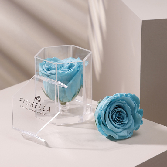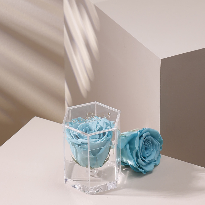 An elegant preserved rose displayed in a sleek 3.5 x 2.5 inch hexagonal glass box. Perfectly designed to brighten any space and last a minimum of 12 months.