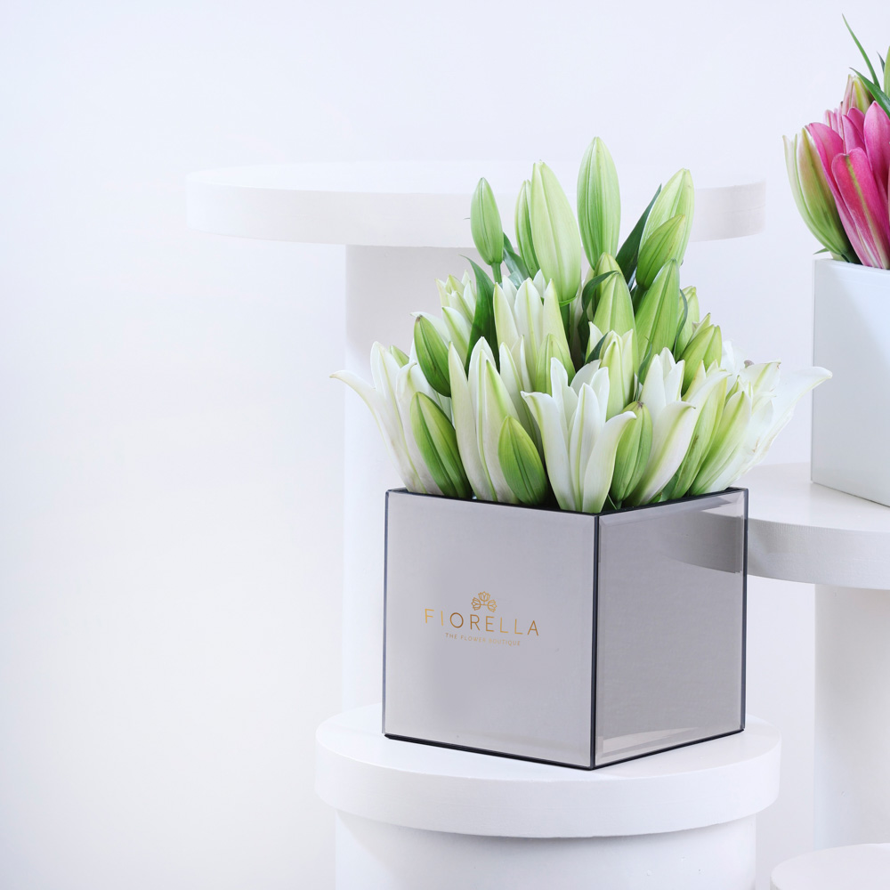 Presenting our best-selling 6x6 inch Mirror finish cube filled with 8-10 Lilies: The epitome of elegance and luxury.