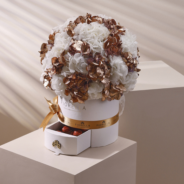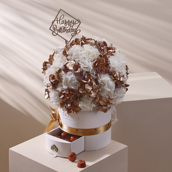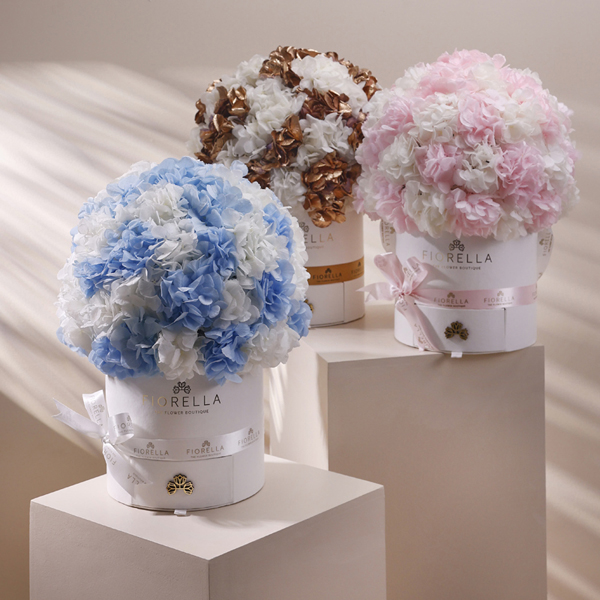 Experience the timeless allure of Forever Hydrangeas, celebrated for their ability to retain beauty for over a year. Presented in a luxurious 7.5 × 8 inch round box, this arrangement features 4 stems of hydrangeas in a stunning variety of colors, making it a true statement of elegance.