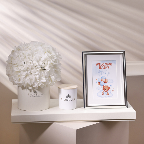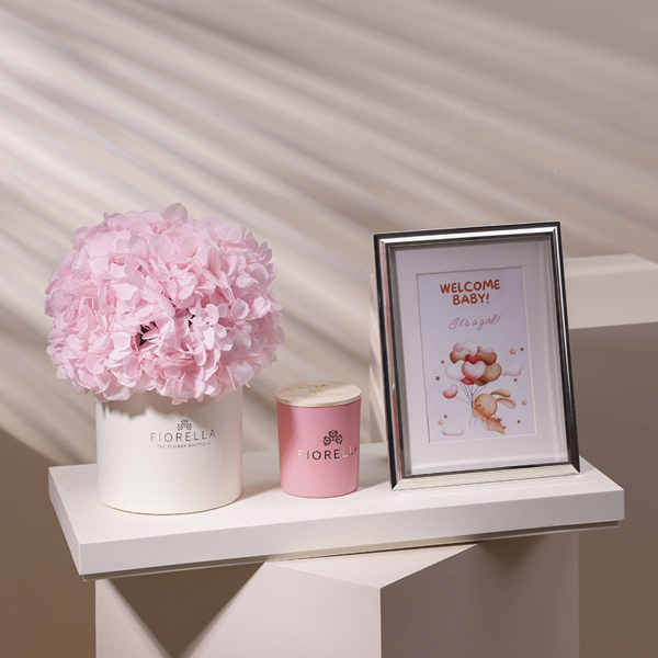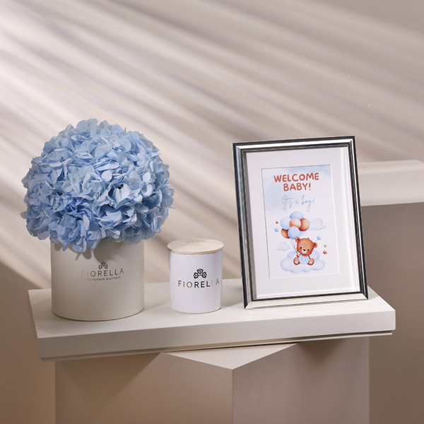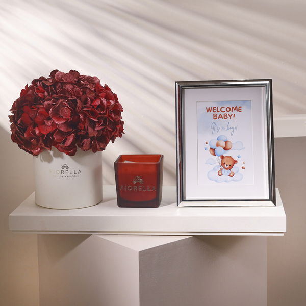 Celebrate love with the Forever Moments Tray — a sleek and modern keepsake featuring Forever Hydrangeas that last one year, a luxurious scented candle, and a timeless photo frame to hold your cherished memory.
