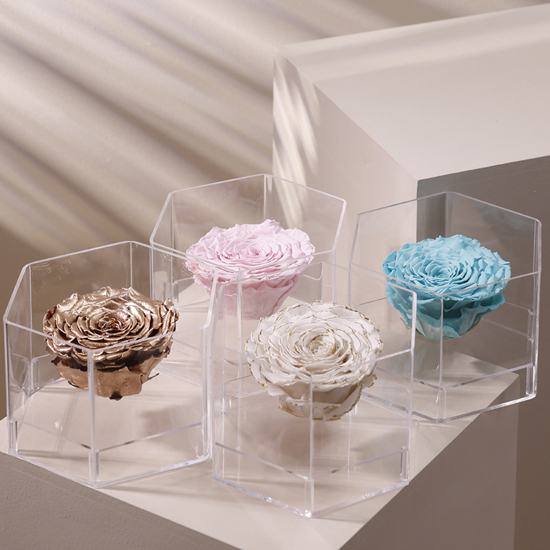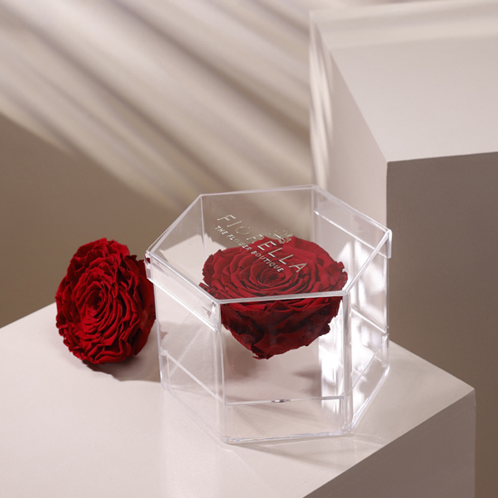 A bold and romantic gesture, featuring a large preserved rose displayed in a striking 4.5 × 6 inch acrylic box. Designed to make a lasting impression and stay beautiful for a year—no effort needed.